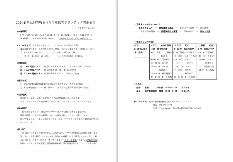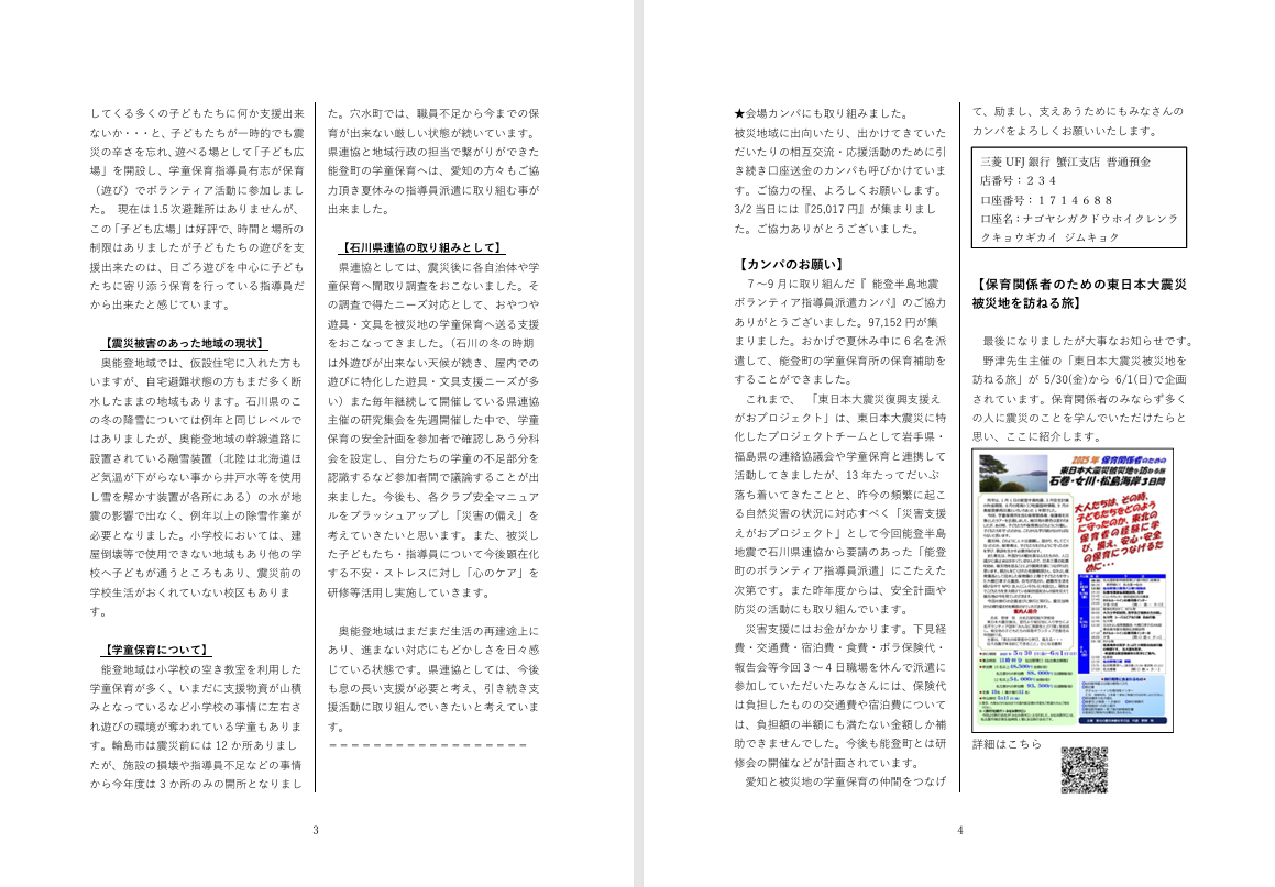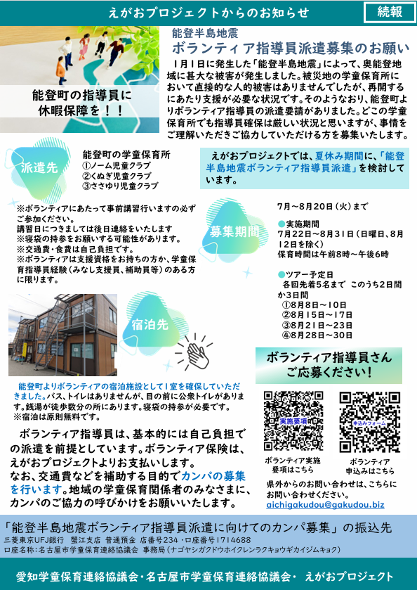 | 「能登半島地震ボランティア指導員派遣に向けてのカンパ募集」の振込先 三菱東京UFJ銀行蟹江支店普通預金店番号234・口座番号1714688 口座名称:名古屋市学童保育連絡協議会事務局 (ナゴヤシガクドウホイクレンラクキョウギカイジムキョク) |