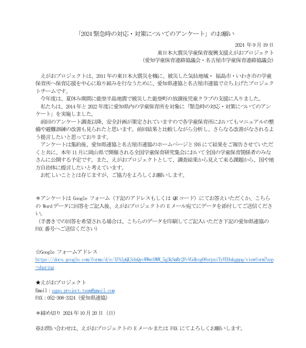 えがおプロジェクトより、県連協加盟学童保育所へ「緊急時の対応・対策についてアンケート」調査の協力依頼のお知らせです。 えがおプロジェクトは、2011年の東日本大震災を機に、被災した気仙地域・ 福島市・いわき市の学童保育所へ保育応援を中心に取り組みを行なうために、愛知県連協と名古屋市連協で立ち上げたプロジェクトチームです。 今年度は、夏休み期間に能登半島地震で被災した能登町の放課後児童クラブの支援に入りました。2014年と2022年度に愛知県内の学童保育所を対象に「緊急時の対応・対策についてのアンケート」を実施しました。 前回のアンケート調査以降、安全計画が策定されていますので各学童保育所においてもマニュアルの整備や避難訓練の改善も見られたと思います。前回結果と比較しながら分析し、さらなる改善がなされるよう提言したいと思っております。 アンケートは集約後、愛知県連協ホームページとSNSにて結果をご報告させていただくと共に、本年11月に岡山県で開催される全国学童保育研究集会において全国の学童保育関係者のみなさんに公開する予定です。また、えがおプロジェクトとして、調査結果から見えて来る課題から、国や地方自治体に提言したいと考えています。 お忙しいこととは存じますが、ご協力をよろしくお願いします。アンケートフォームには下記よりお入りください。