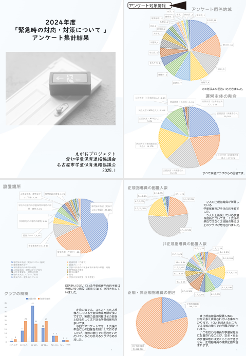 アンケートは集約後、愛知県連協と名古屋市連協のホームページと SNS にて結果をご報告させていただき、えがおプロジェクトで交流を続けている岩手・気仙地域、福島市、いわき市の学童保育とも情報を共有して、どのような備えが大事なのかを、今一度確認し、その結果を発信していきたいと考えています。