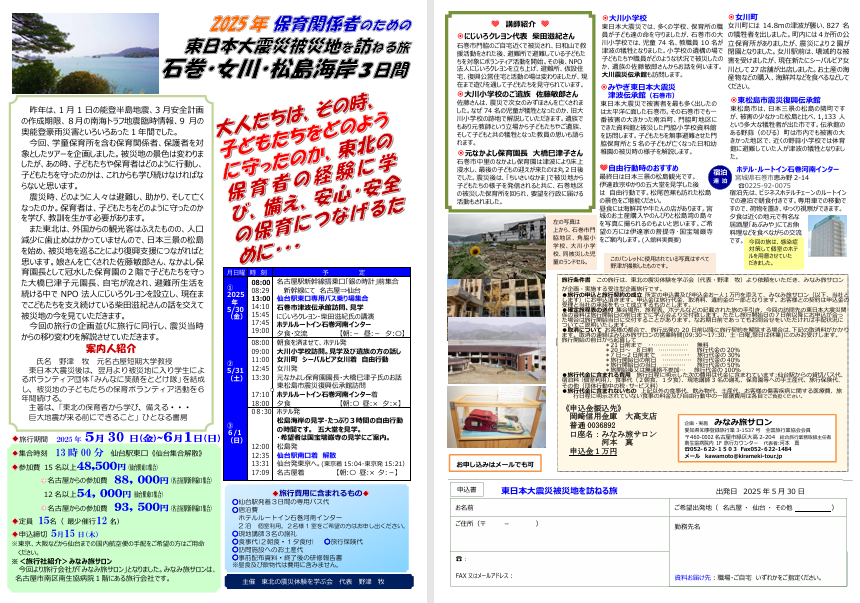 あいち研究集会や、全国学童保育研究集会の安全計画の分科会でおなじみの野津先生主催による「2025年保育関係者のための東日本大震災被災地を訪ねる旅」のご紹介です。