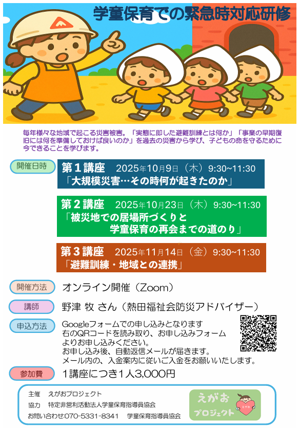 えがおプロジェクト主催、特定非営利活動法人学童保育指導員協会協力にて、学童保育での緊急対応研修を3講座開催します。安全計画の研修は計画通り受講できていますか?安全計画に合わせた研修の1つにも活用できる内容です。実態に即した避難訓練や、発災後の学童保育の早期復旧にはどんな準備が必要か?など、過去の災害からの学びや、子どもの命を守るために今できることを学びます。オンライン(Zoom)での開催です。県連協加盟に関係なく多くの方が参加いただけます。ぜひお早めにお申し込みください。
