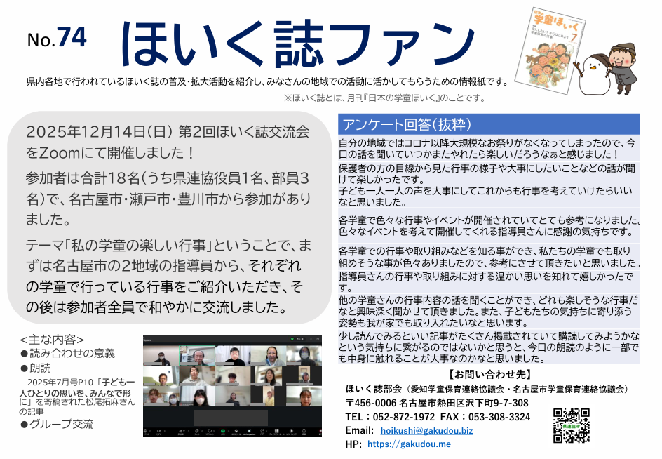 ほいく誌ファンNo.74では、第2回ほいく誌交流会の様子が報告されています。テーマは「私の学童の楽しい行事」で交流しました。