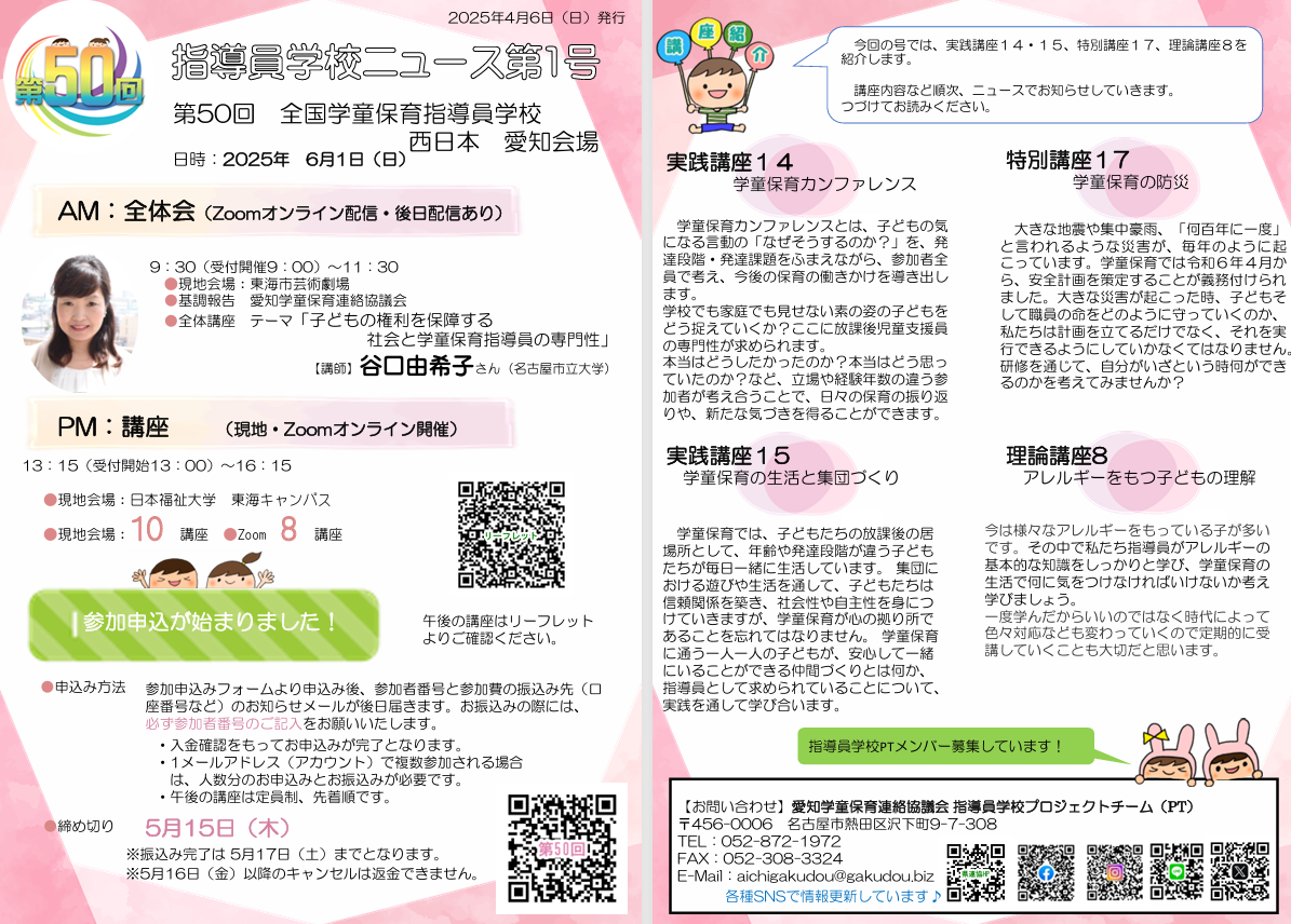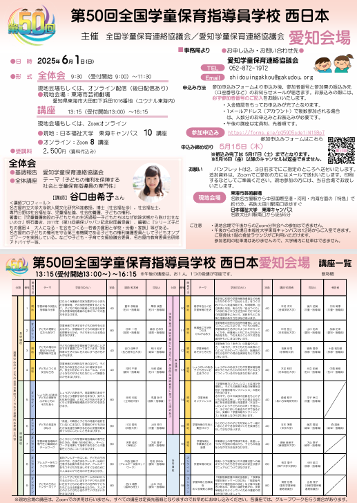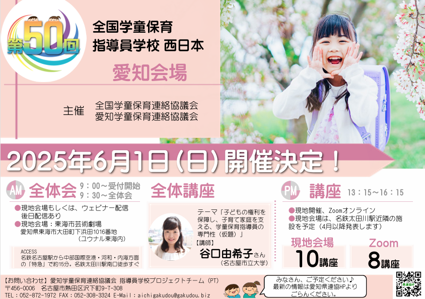 第50回全国学童保育指導員学校 西日本 愛知会場は、2025年6月1日(日)に開催が決定しています。全体会記念講座は、谷口由希子さん(名古屋市立大学)です。テーマは「子どもの権利を保障し、子育て家庭を支える、学童保育指導員の専門性(仮題)」です。6月1日は指導員学校をみなさんご予定ください。