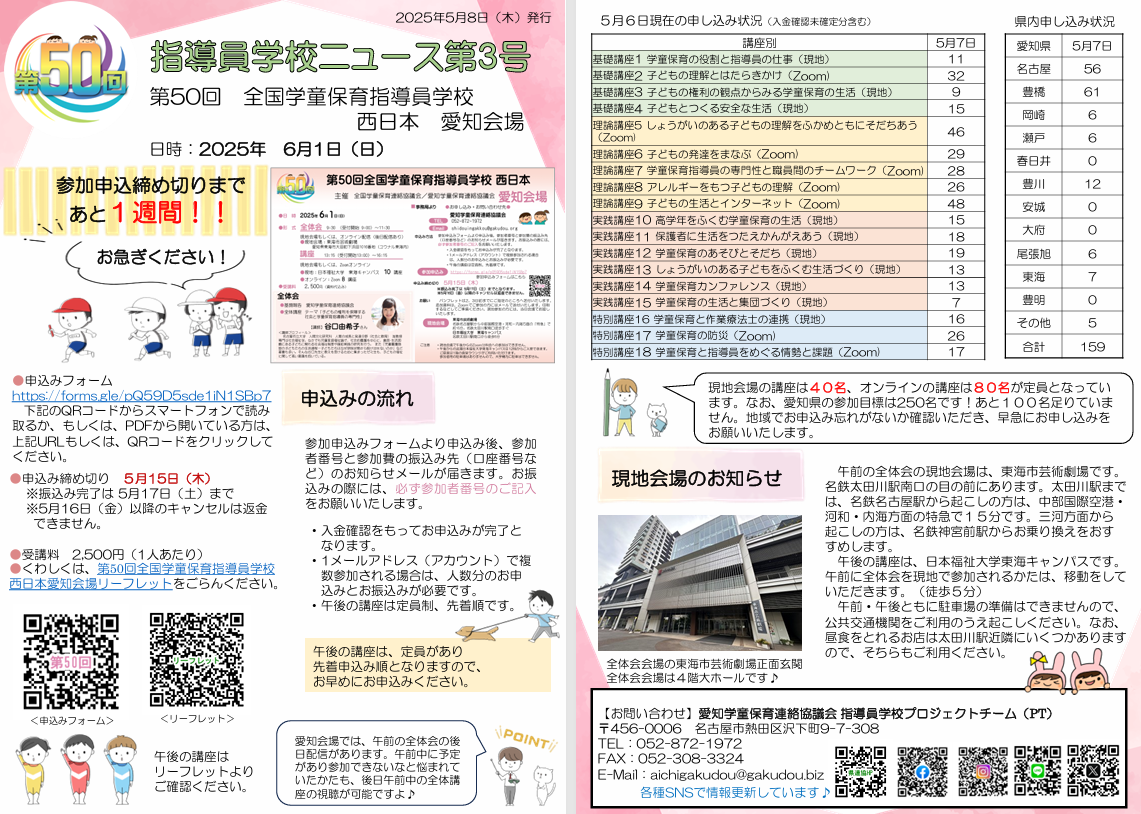 第50回全国学童保育指導員学校西日本愛知会場のリーフレットが完成し、参加申込も開始いたしました。参加申込の締め切りは、5月15日です。(振込完了は5月17日、5月16日以降のキャンセルは返金ができません)各講座には定員が設けられております。お申込み先着順となりますので、ご希望の講座がある方はお早めにお申込みください。